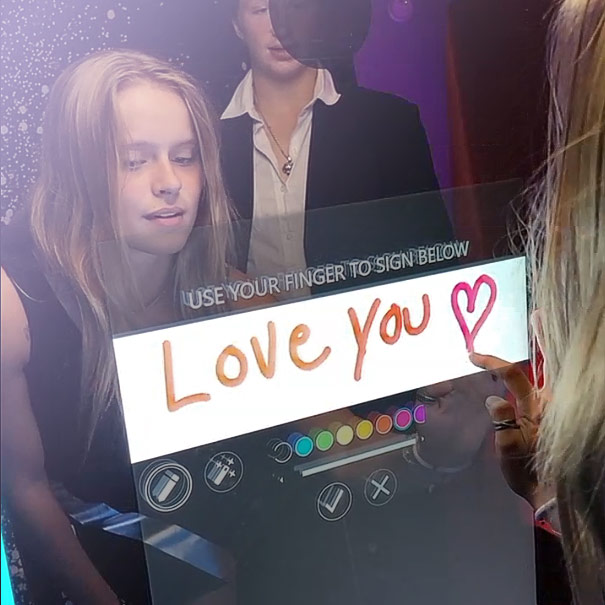 Now that the guests have taken the photos the mirror displays another message asking the guest to apply a filter if they wish or add digital props to the pictures. And, for even more personalized experience, sign or add their name to the photo.